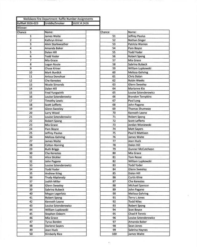 Here is the list of names and number assignments for Raffle#2026-023 Griddle/Smoker double draw